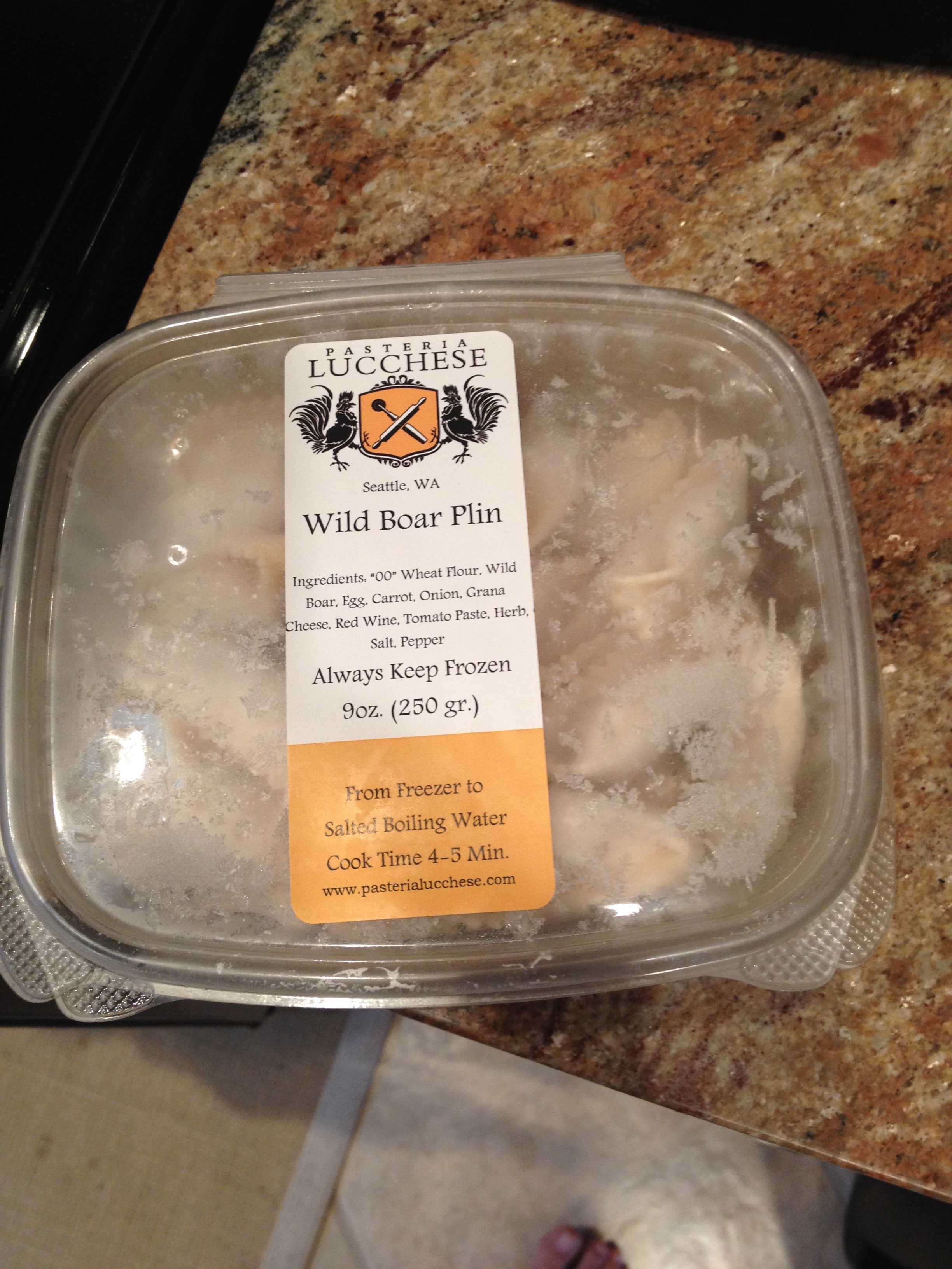 In freezer find main ingredient – Wild boar ravioli (plin) – bought at farmer’s market too long ago to remember (< six months ago).